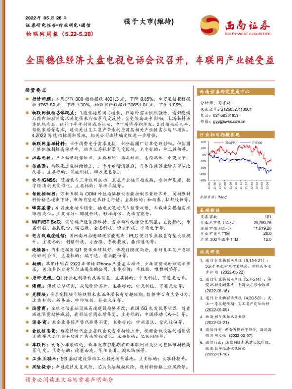 【西南证券】【20220528】物联网周报:全国稳住经济大盘电视电话会议召开,车联网产业链受益-20页 行业研究