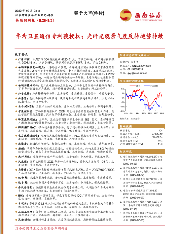 【西南证券】【20220903】20220903-西南证券-物联网周报:华为卫星通信专利获授权;光纤光缆景气度反转趋势持续-22页 行业研究
