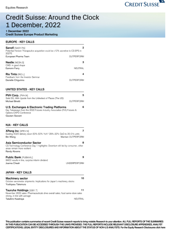 【Credit Suisse】【20221201】Credit Suisse Around the Clock-11页 行业研究