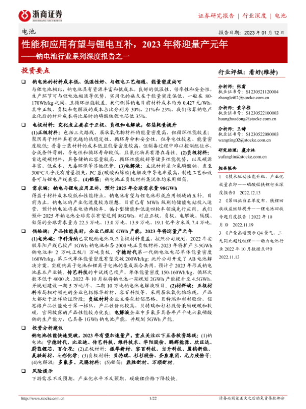 【浙商证券】【20230112】性能和应用有望与锂电互补,2023年将迎量产元年——钠电池行业系列深度报告之一-22页 行业研究