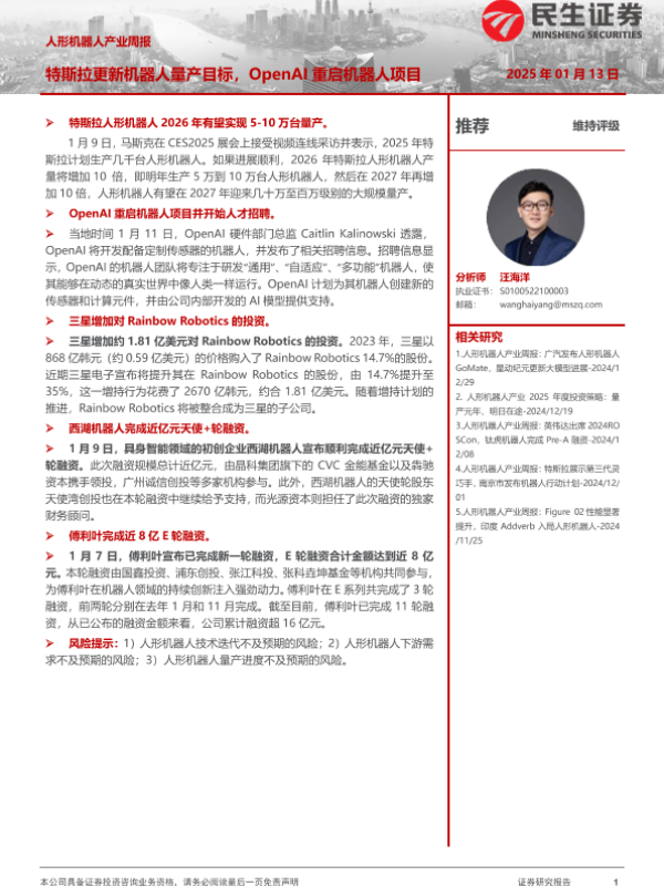 【民生证券】【20250113】20250113-民生证券-人形机器人产业周报:特斯拉更新机器人量产目标,OpenAI重启机器人项目-10页 行业研究