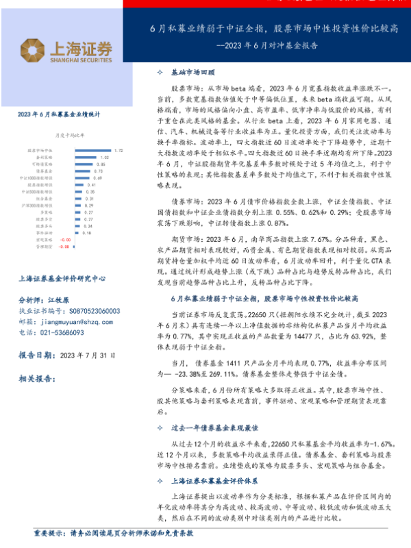 【上海证券】【20230731】2023年6月对冲基金报告_6月私募业绩弱于中证全指_股票市场中性投资性价比较高-17页 行业研究