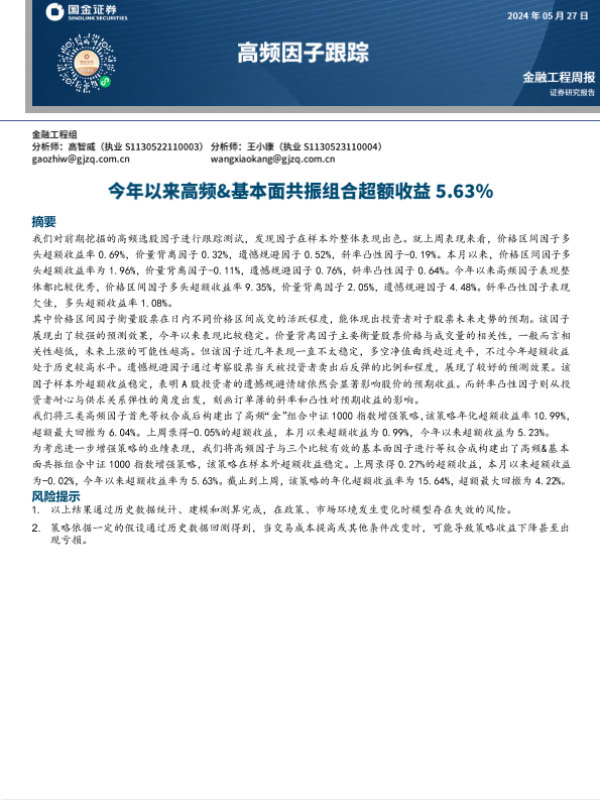 【国金证券】【20240527】高频因子跟踪:今年以来高频&基本面共振组合超额收益5.63%-16页 行业研究