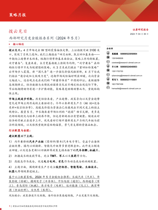 【西部证券】【20240430】西部研究月度金股报告系列(2024年5月):拨云见日-15页 行业研究