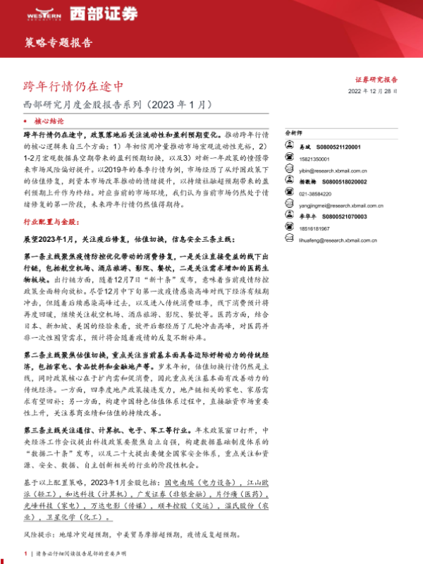 【西部证券】【20221228】西部研究月度金股报告系列(2023年1月):跨年行情仍在途中-15页 行业研究