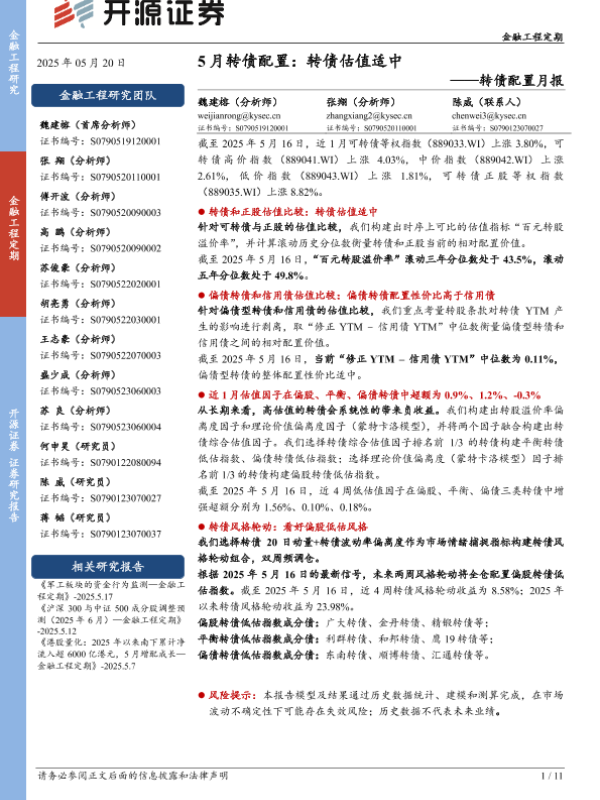 【开源证券】【20250520】5月转债配置:转债估值适中-11页 证券期货研究报告