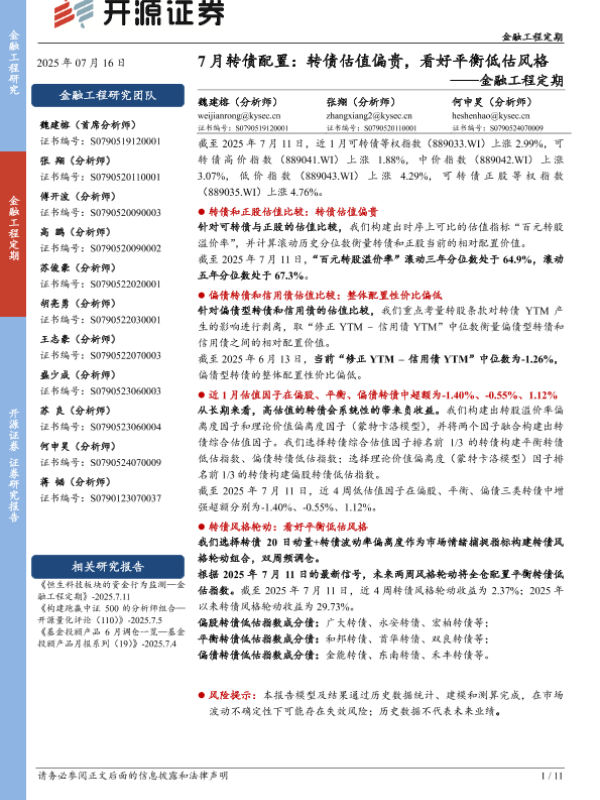 【开源证券】【20250716】7月转债配置,转债估值偏贵,看好平衡低估风格-11页 证券期货研究报告