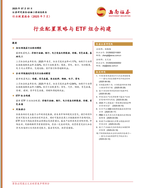 【西南证券】【20250701】行业配置报告(2025年7月):行业配置策略与ETF组合构建-12页 证券期货研究报告
