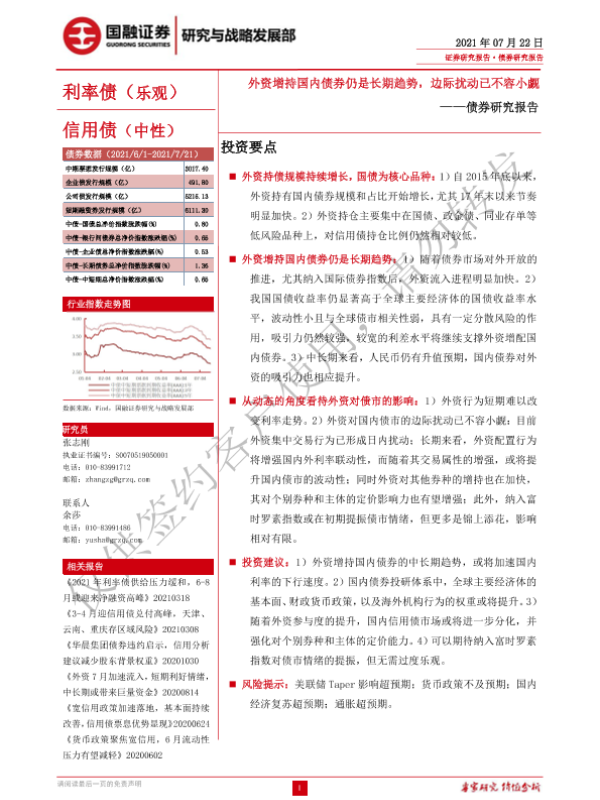 【国融证券】【20210722】债券研究报告:外资增持国内债券仍是长期趋势,边际扰动已不容小觑-20页 行业研究