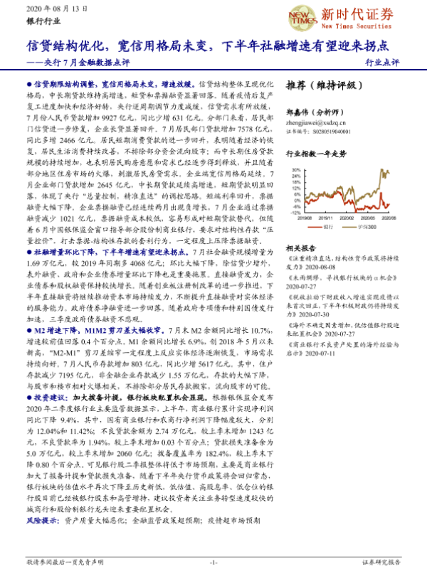 【新时代证券】【20200813】央行7月金融数据点评:信贷结构优化,宽信用格局未变,下半年社融增速有望迎来拐点-10页 行业研究