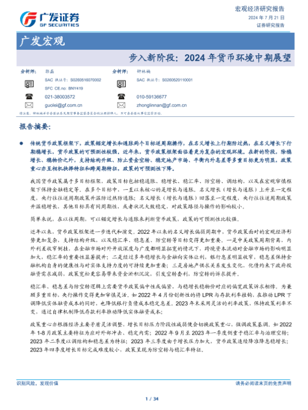 【广发证券】【20240721】步入新阶段:2024年货币环境中期展望-34页 行业研究