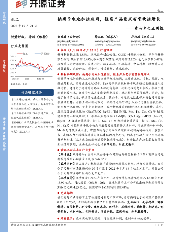 【开源证券】【20220724】新材料行业周报:钠离子电池加速应用,锰系产品需求有望快速增长-13页 行业研究