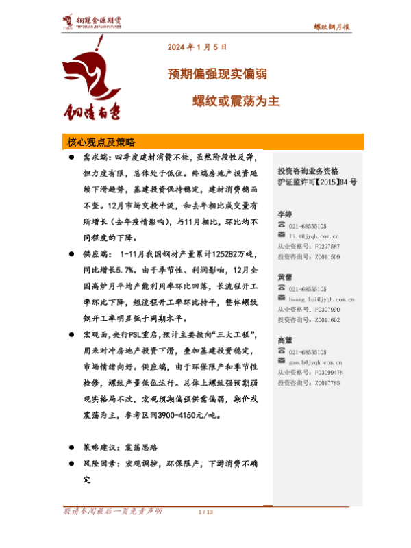 【金源期货】【20240105】螺纹钢月报:预期偏强现实偏弱 螺纹或震荡为主-13页 行业研究