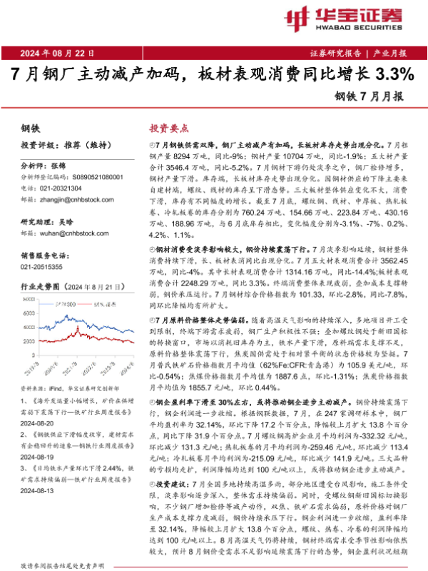 【华宝证券】【20240822】钢铁行业7月月报:7月钢厂主动减产加码,板材表观消费同比增长3.3%-19页 行业研究