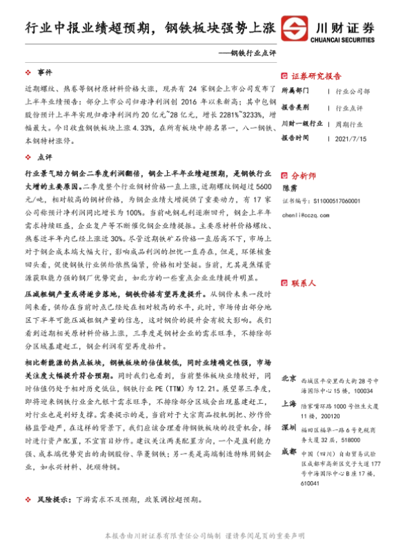 【川财证券】【20210715】行业中报业绩超预期,钢铁板块强势上涨-2页 证券期货研究报告