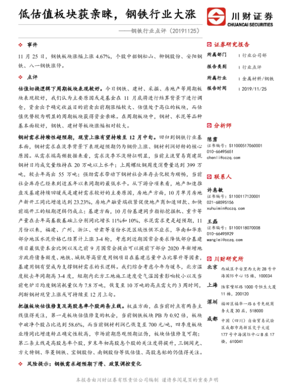 【川财证券】【20191125】钢铁行业点评:低估值板块获亲睐,钢铁行业大涨-2页 证券期货研究报告