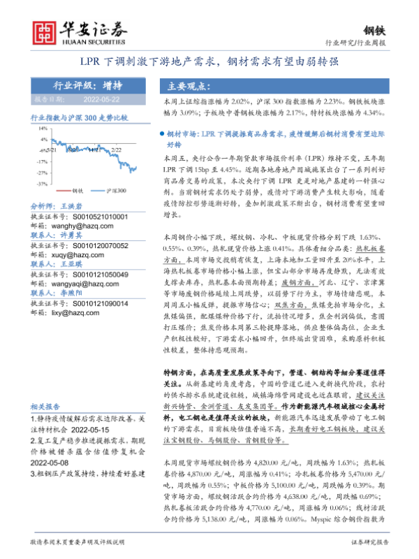 【华安证券】【20220522】20220522-华安证券-钢铁行业周报:LPR下调刺激下游地产需求,钢材需求有望由弱转强-23页 行业研究