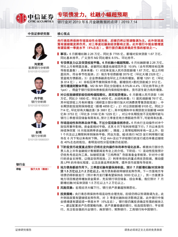 【中信证券】【20190714】银行业对2019年6月金融数据的点评-3页 行业研究
