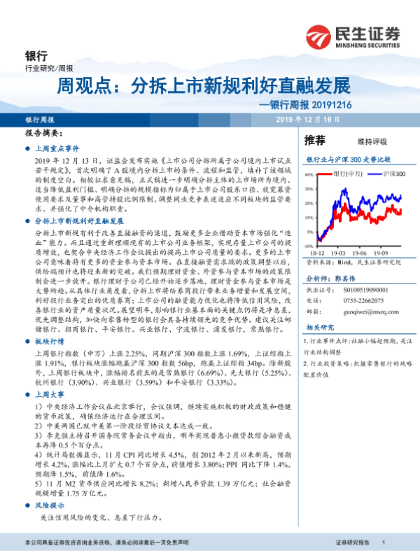 【民生证券】【20191216】银行周报:分拆上市新规利好直融发展-16页 行业研究