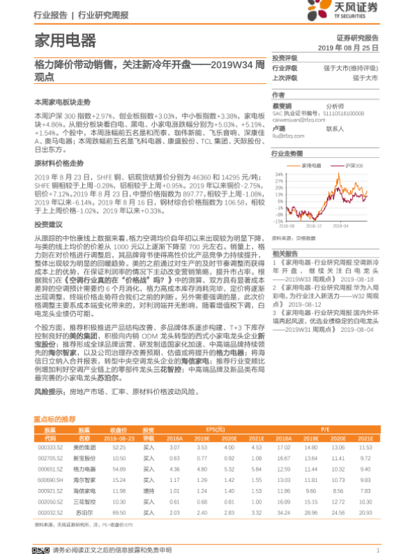 【天风证券】【20190825】家用电器2019W34周观点:格力降价带动销售,关注新冷年开盘-11页 行业研究