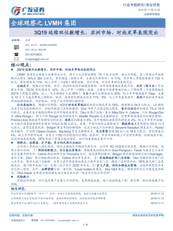 【广发证券】【20191113】全球观察之LVMH集团:3Q19延续双位数增长,亚洲市场、时尚皮革表现突出-5页 行业研究