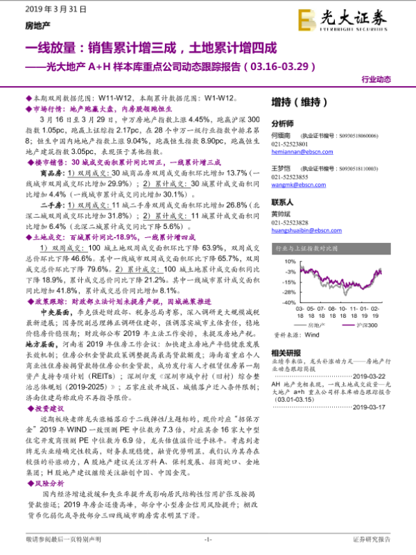 【光大证券】【20190331】一线放量:销售累计增三成,土地累计增四成-15页 行业研究