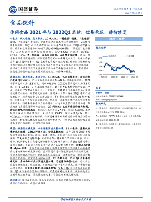【国盛证券】【20220504】食品饮料:休闲食品2021年与2022Q1总结:短期承压,静待修复-10页 行业研究