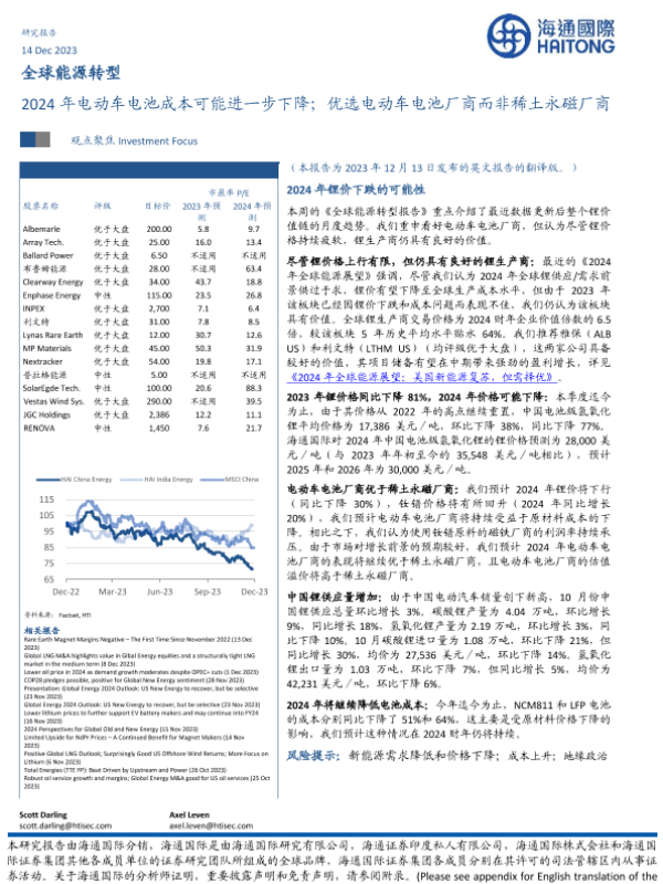 【海通国际】【20231214】2024年电动车电池成本可能进一步下降;优选电动车电池厂商而非稀土永磁厂商-18页 行业研究