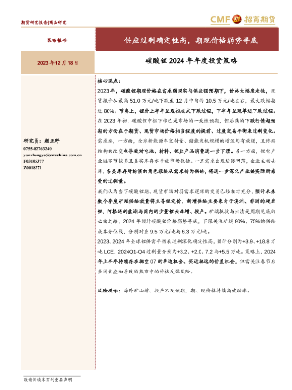 【招商期货】【20231218】碳酸锂2024年年度投资策略:供应过剩确定性高,期现价格弱势寻底-12页 行业研究