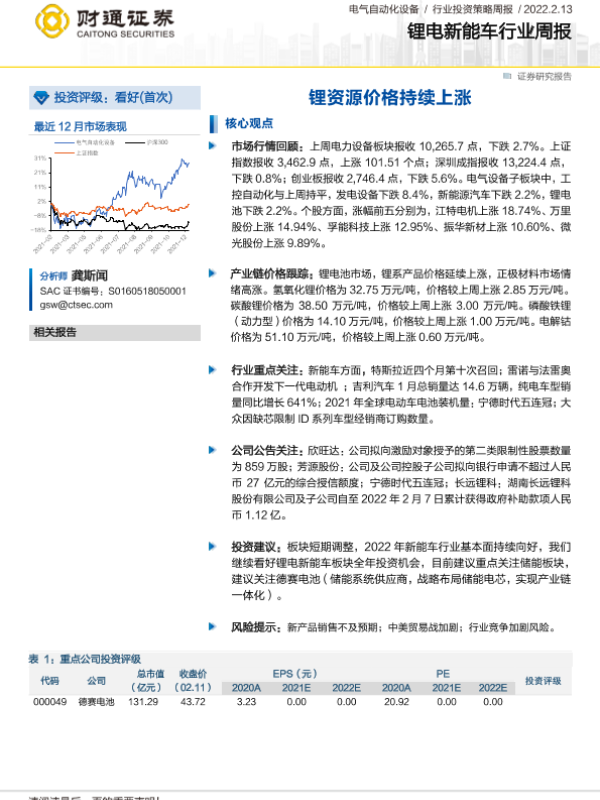 【财通证券】【20220213】锂电新能车行业周报:锂资源价格持续上涨-19页 行业研究
