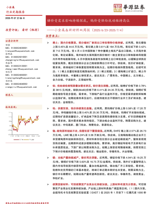 【华源证券】【20250706】小金属&新材料双周报:锑价受需求影响持续探底,钨价受供给扰动维持高位-12页 证券期货研究报告