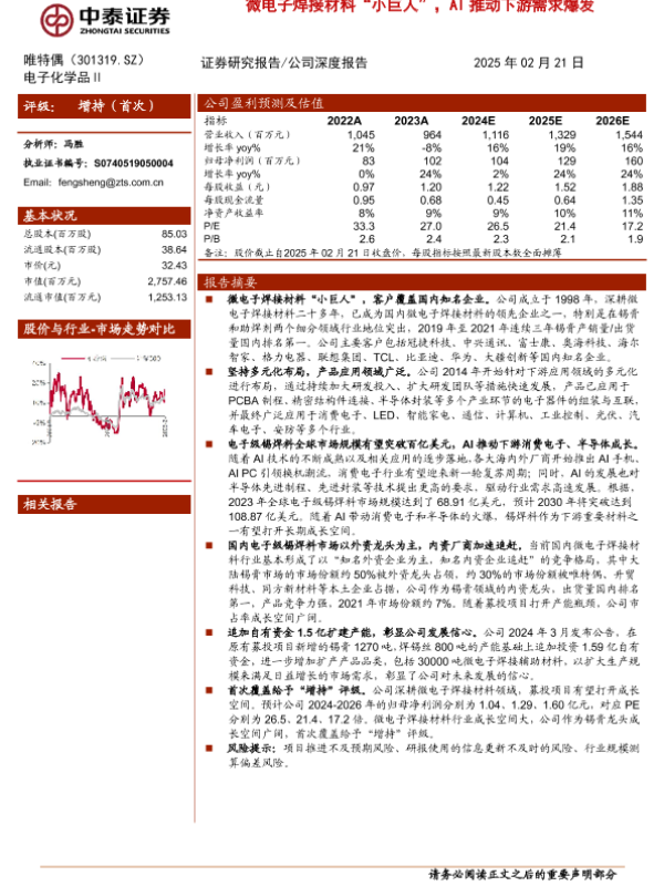 【中泰证券】【20250221】唯特偶(301319):微电子焊接材料“小巨人”,AI推动下游需求爆发-20页 行业研究