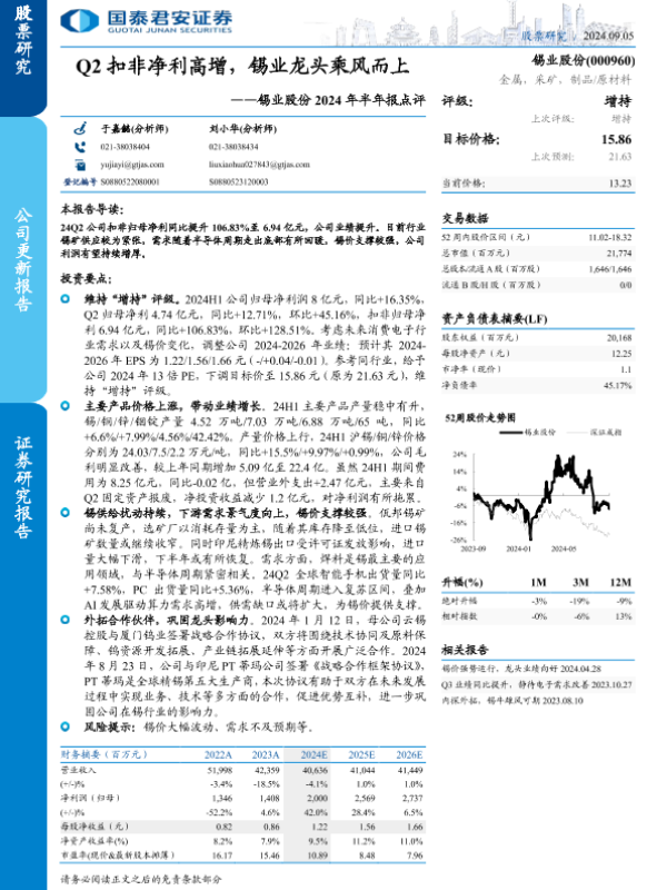 【国泰君安证券】【20240905】锡业股份(000960)2024年半年报点评:Q2扣非净利高增,锡业龙头乘风而上-11页 行业研究