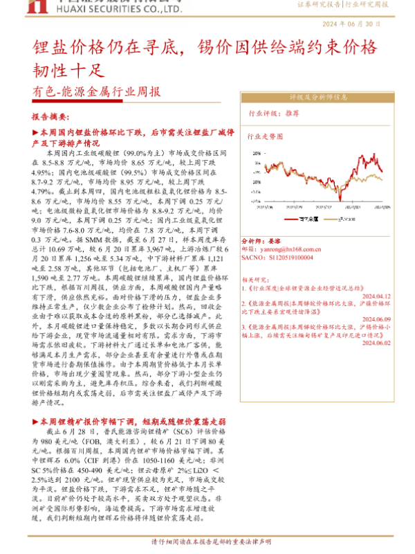 【华西证券】【20240630】20240630-华西证券-有色-能源金属行业周报:锂盐价格仍在寻底,锡价因供给端约束价格韧性十足-19页 行业研究