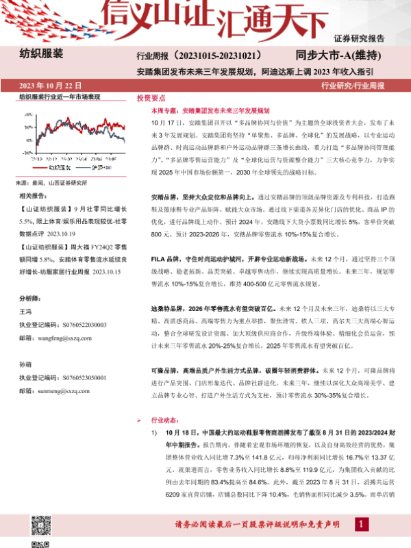 【山西证券】【20231022】纺织服装行业周报:安踏集团发布未来三年发展规划,阿迪达斯上调2023年收入指引-27页 行业研究