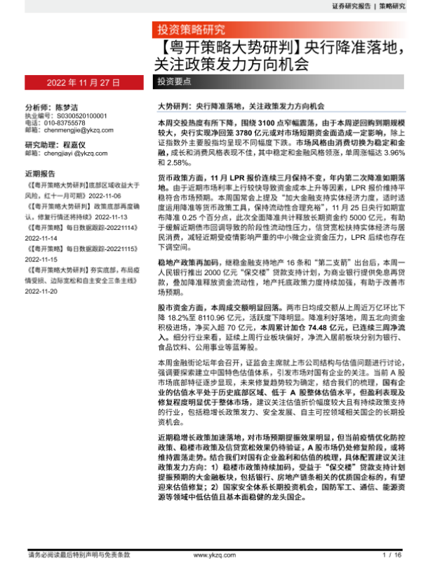 【粤开证券】【20221127】【粤开策略大势研判】央行降准落地,关注政策发力方向机会-16页 行业研究