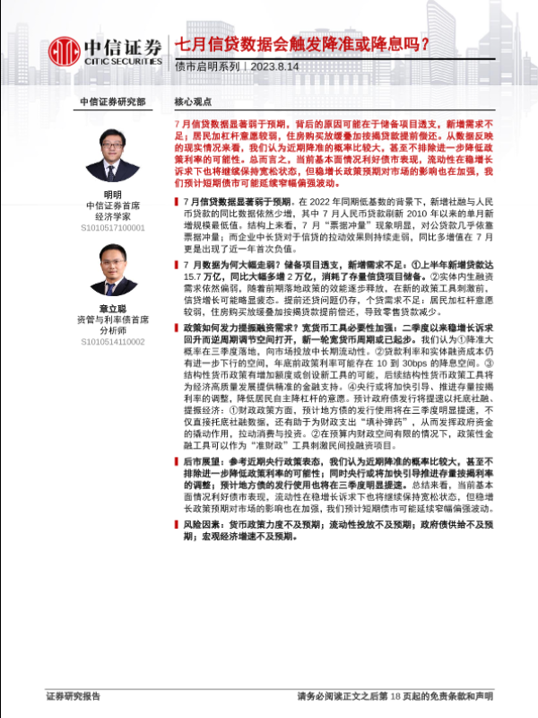 【中信证券】【20230814】债市启明系列:七月信贷数据会触发降准或降息吗?-19页 行业研究