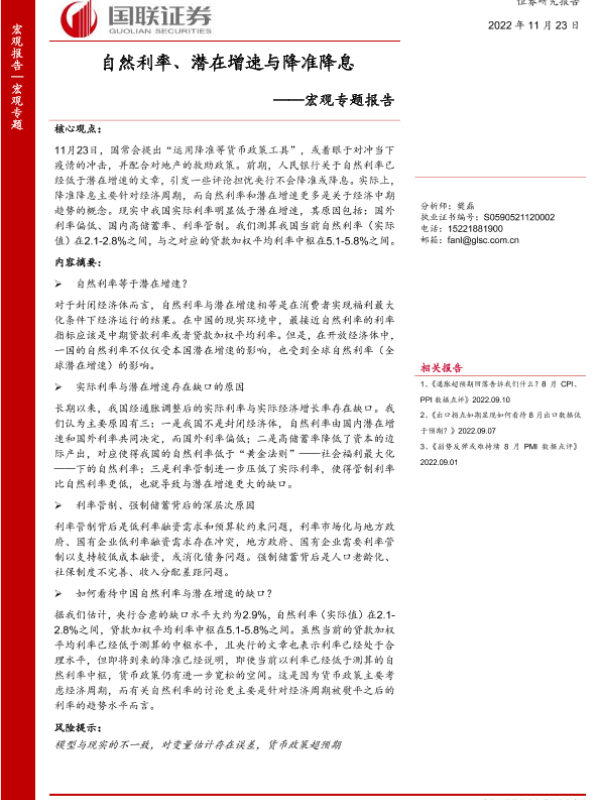 【国联证券】【20221123】宏观专题报告:自然利率、潜在增速与降准降息-21页 行业研究