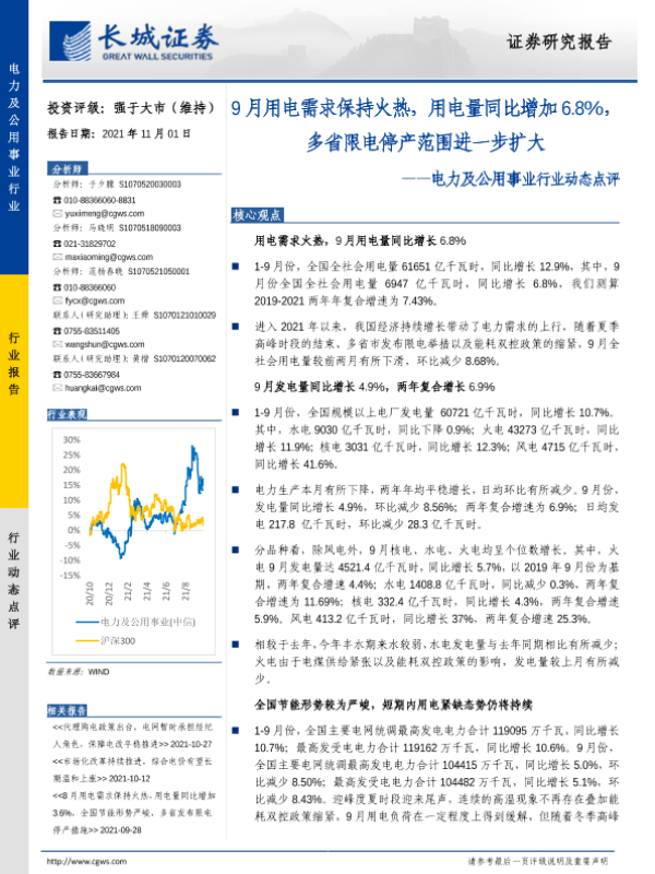 【长城证券】【20211101】电力及公用事业行业动态点评:9月用电需求保持火热,用电量同比增加6.8%,多省限电停产范围进一步扩大-18页 行业研究