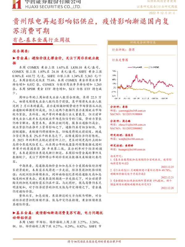 【华西证券】【20221231】有色-基本金属行业周报:贵州限电再起影响铝供应,疫情影响渐退国内复苏消费可期-25页 行业研究