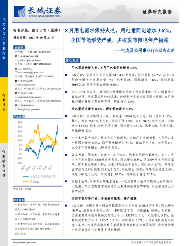 【长城证券】【20210927】电力及公用事业行业动态点评:8月用电需求保持火热,用电量同比增加3.6%,全国节能形势严峻,多省发布限电停产措施-17页 行业研究