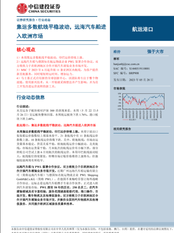 【中信建投证券】【20230528】航运港口行业:集运多数航线平稳波动,远海汽车船进入欧洲市场-26页 行业研究