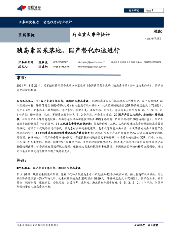 【国信证券】【20211129】医药保健行业重大事件快评:胰岛素国采落地,国产替代加速进行-7页 行业研究