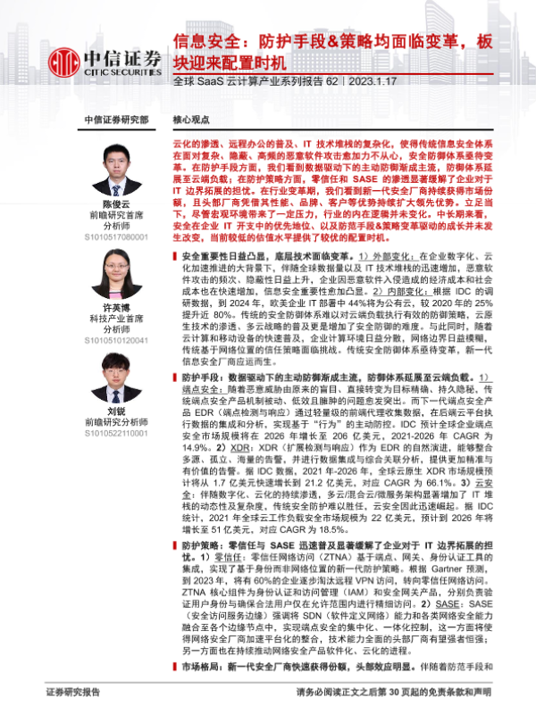 【中信证券】【20230117】全球SaaS云计算行业产业系列报告62:信息安全,防护手段&策略均面临变革,板块迎来配置时机-31页 行业研究