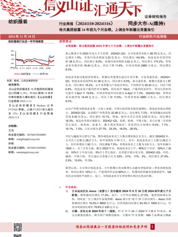 【山西证券】【20241118】纺织服装行业周报:裕元集团披露24年前九个月业绩,上调全年鞋履出货量指引-18页 行业研究