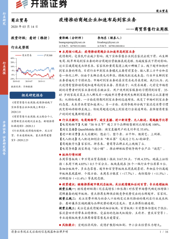 【开源证券】【20200314】商贸零售行业周报:疫情推动商超企业加速布局到家业务-16页 行业研究