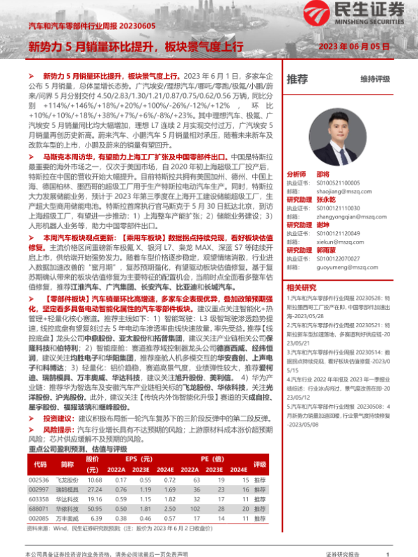 【民生证券】【20230605】汽车和汽车零部件行业周报:新势力5月销量环比提升,板块景气度上行-21页 行业研究