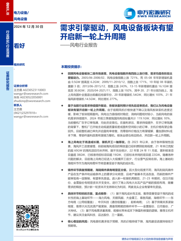 【申万宏源】【20241230】风电行业报告:需求引擎驱动,风电设备板块有望开启新一轮上升周期-21页 行业研究
