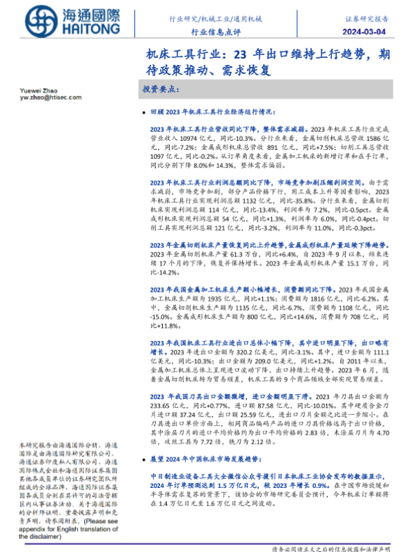 【海通国际】【20240304】机床工具行业:23年出口维持上行趋势,期待政策推动、需求恢复-12页 行业研究