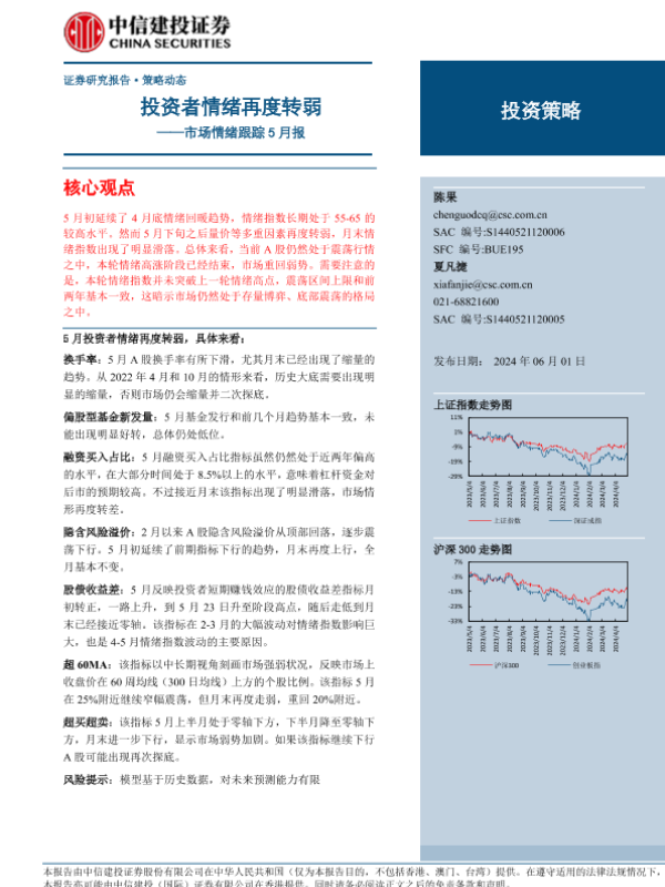 【中信建投证券】【20240601】市场情绪跟踪5月报:投资者情绪再度转弱-10页 行业研究